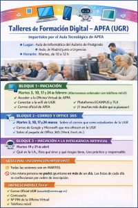 El Aula Tecnológica ha planificado durante el presente curso 2025-26 unos talleres de formación dirigidos al alumnado APFA con el objetivo primordial de acercar y facilitar el uso de las herramientas digitales que estimamos pueden ser de utilidad tanto para la gestión administrativa como para un mejor aprovechamiento del conocimiento adquirido.